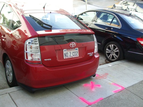 Et après, on dit que les Américains polluent, ben non pas tous ! Regardez la plaque ! Et puis ici, des voitures hybrides, y en a un paquet !!!!!